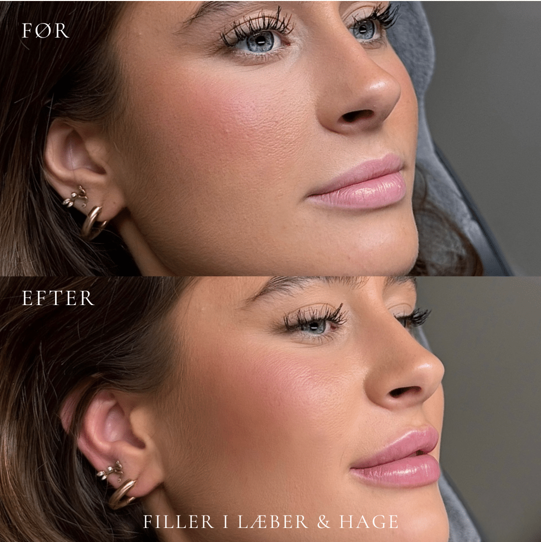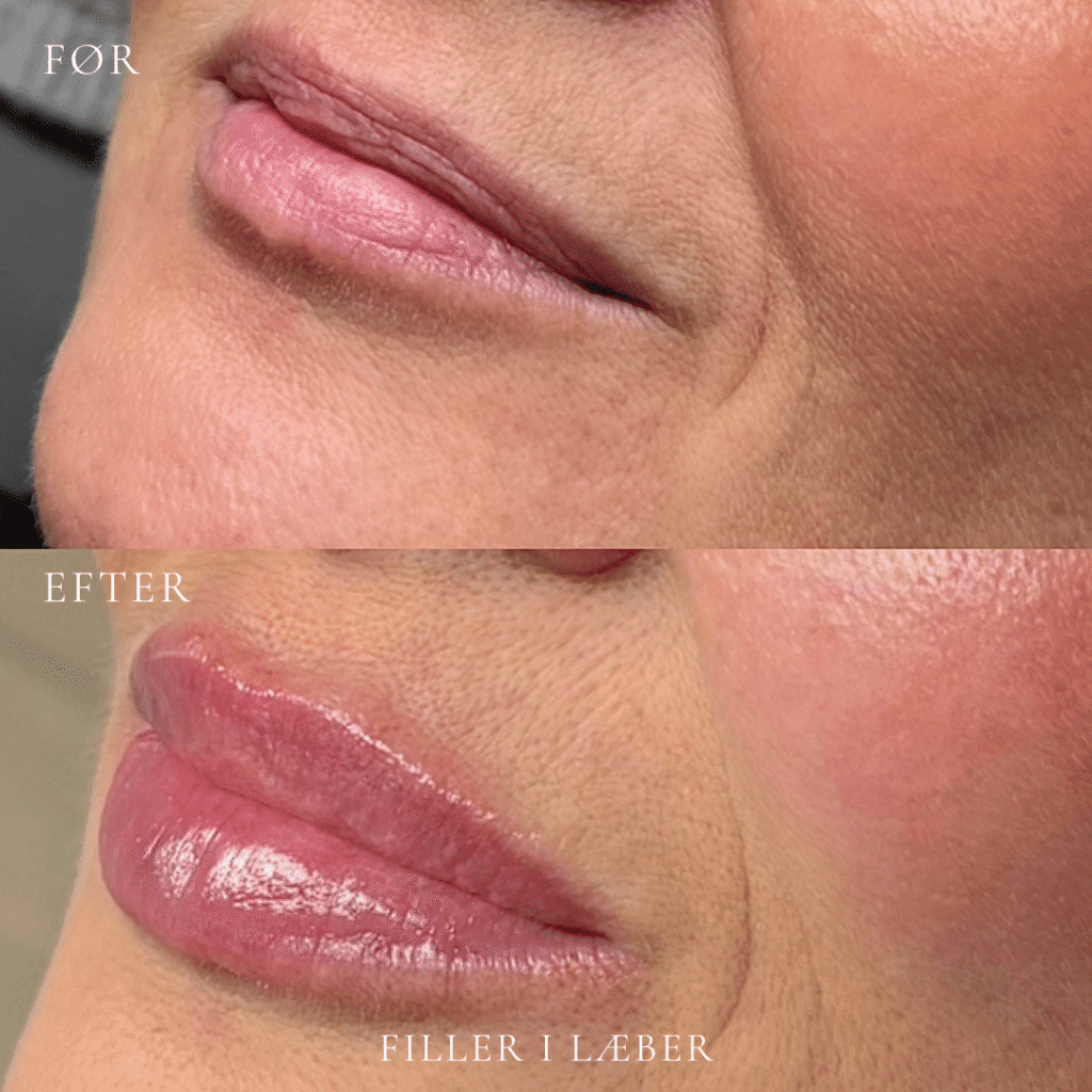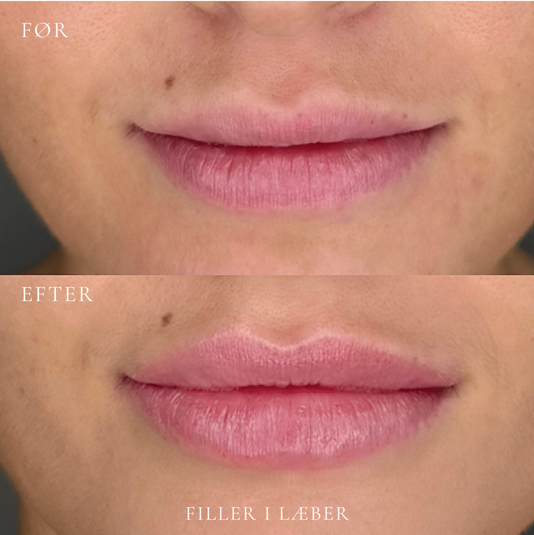 Det endelige resultat ses typisk efter 3–7 dage, når hævelsen har lagt sig. Udtrykket fremstår mere balanceret og harmonisk i forhold til dine ansigtstræk. Holdbarheden er som regel 6-12 måneder og varierer fra person til person.