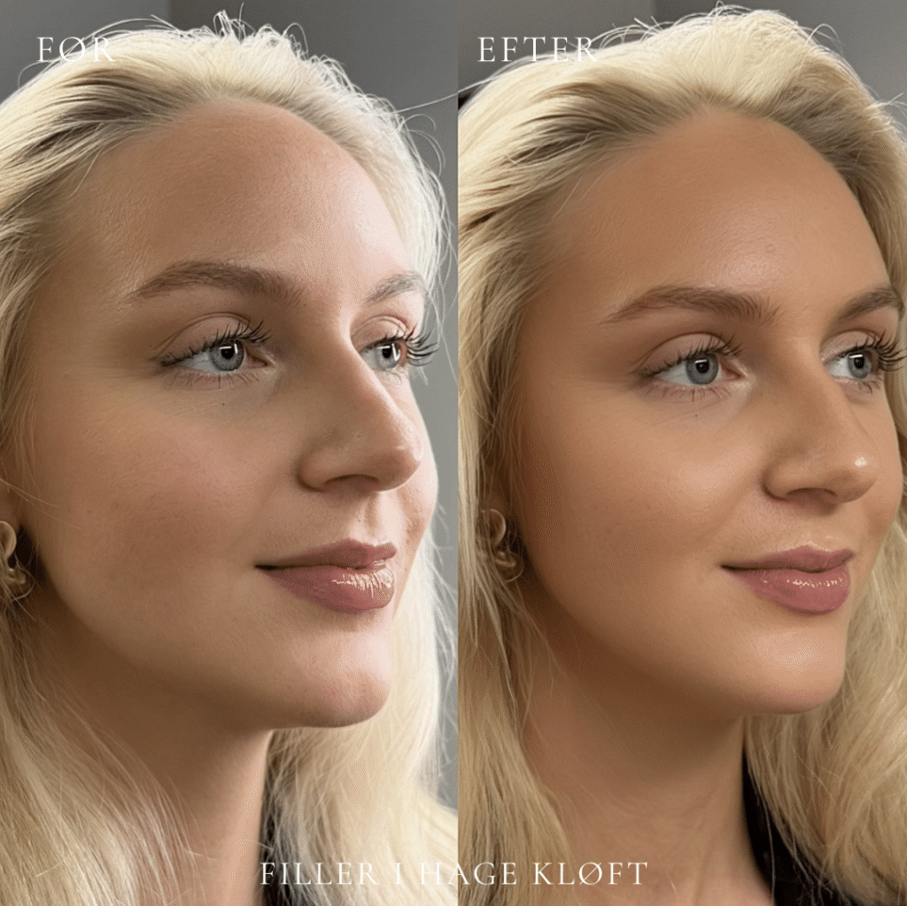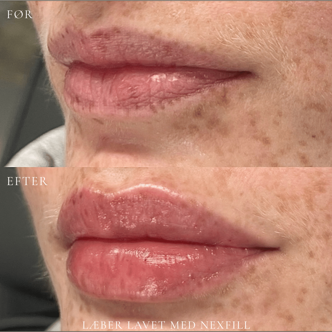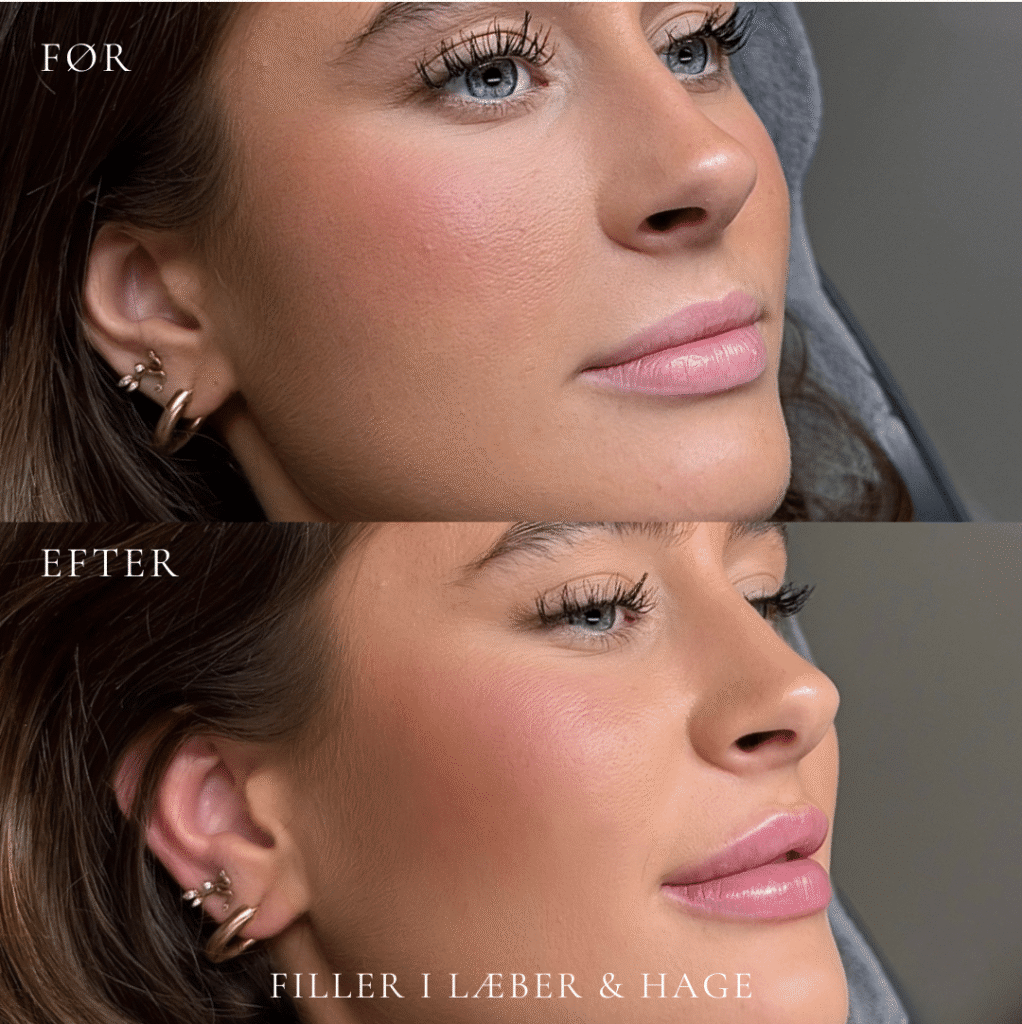 Det endelige resultat ses typisk efter 3–7 dage, når hævelsen har lagt sig. Udtrykket fremstår mere balanceret og harmonisk i forhold til dine ansigtstræk. Holdbarheden er som regel 6-12 måneder og varierer fra person til person.